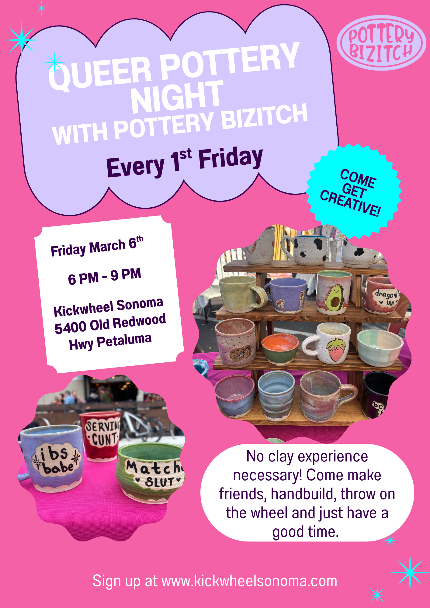 Come join Pottery Bizitch for a night of pottery and community! Queer Pottery Night happens every 1st Friday of the Month. This sign up is for the even on March 6th.