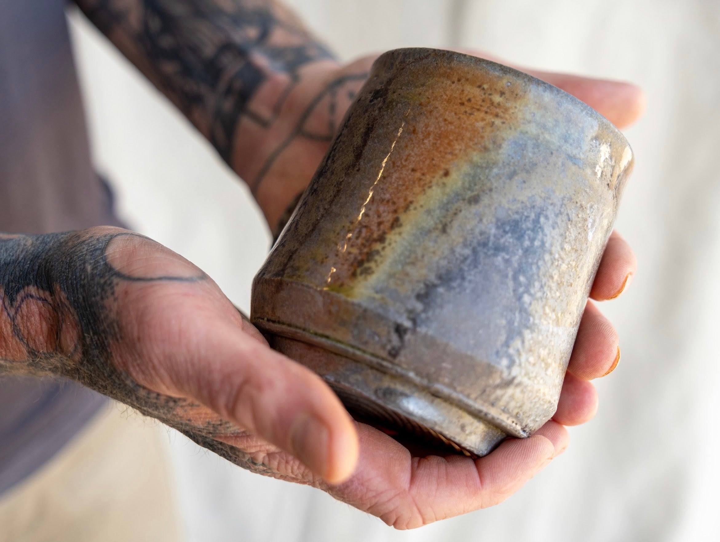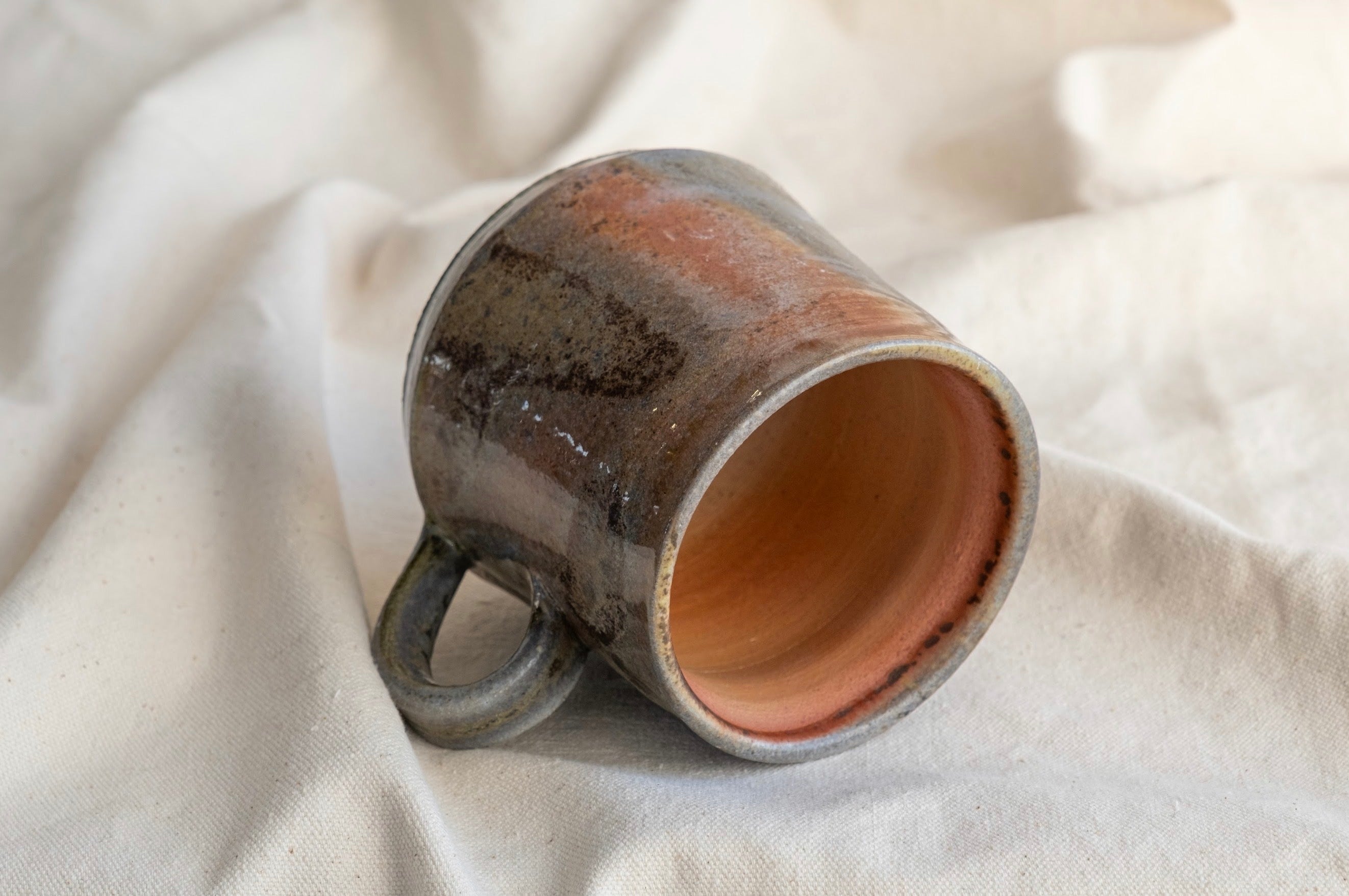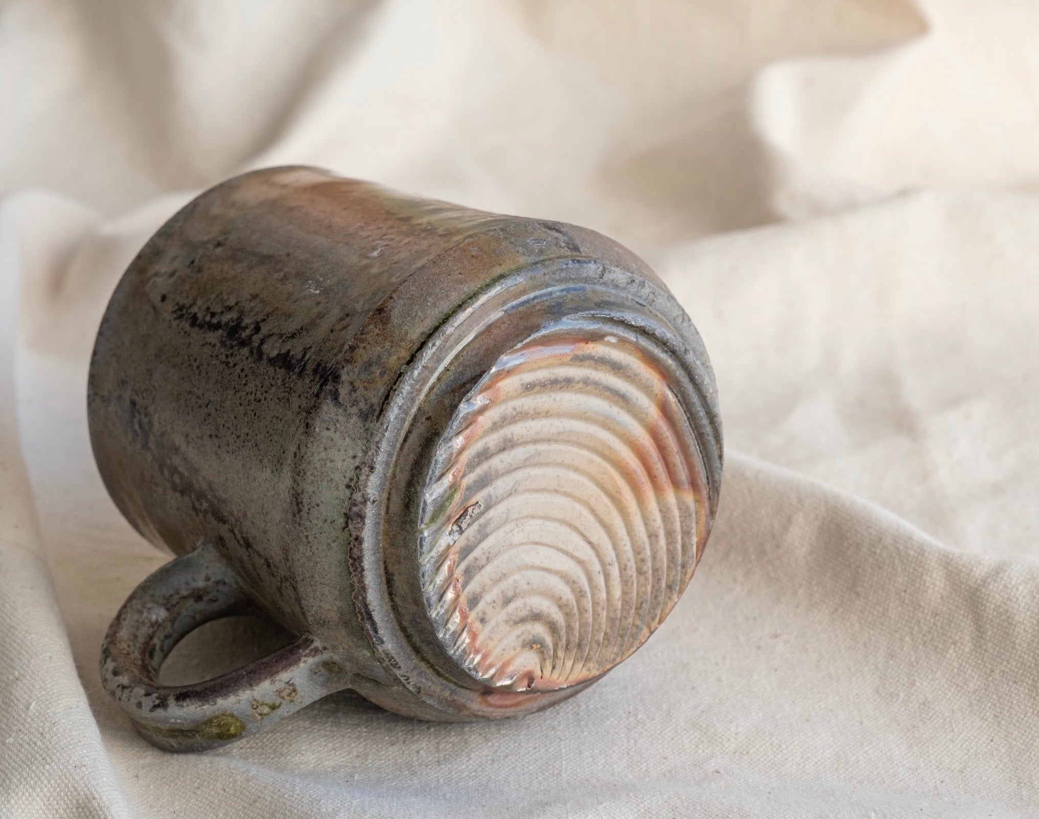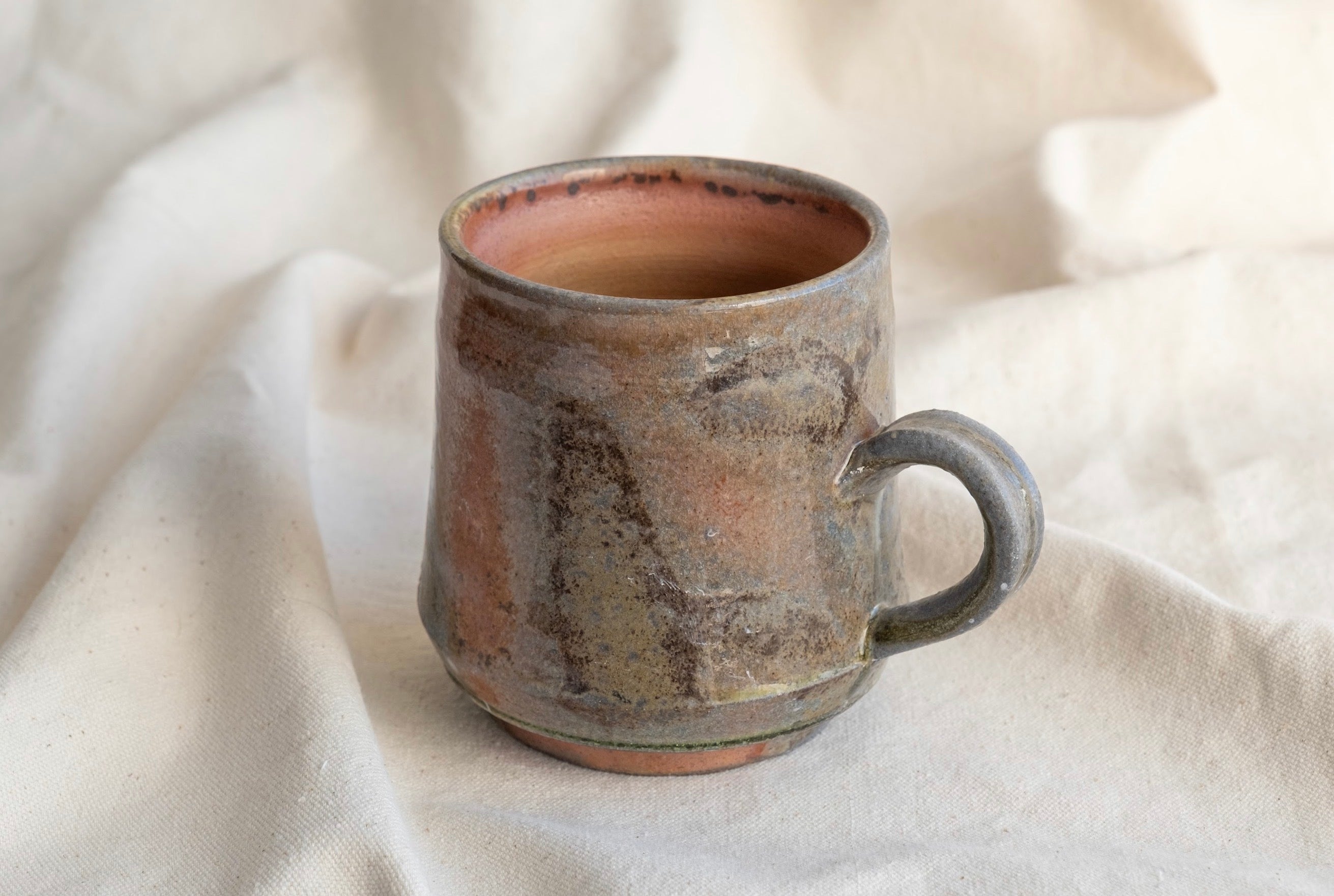 Named after the multifaceted Jazz Artist. This is one of the best mugs Andrew has ever made, woodfired in Forestville CA, at Gina Kuta’s Train Kiln in mid-January 2026. No discernible warping or distortion of form from the High Heat firing, and various hues derived from the hours of woodash coating this mug cover the surface of this piece. A generous one-finger handle will assist bringing this mug to your mouth filled with your favorite beverage. Secret green glass lines the very bottom edge of this mug, a true gem of a find for woodfire and non-woodfire enthusiasts alike. 5 1/4”w x 3 1/2”d x 4 1/4”t